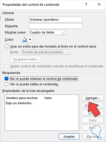 Ahora ajustamos los colores y debemos activar la casilla "No se puede eliminar el control de contenido":