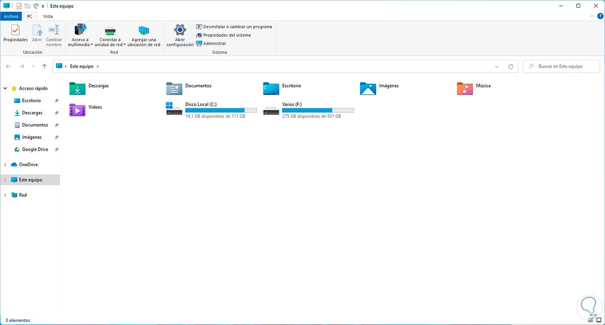 Contamos con acceso a las particiones del disco duro y en general a un conjunto de herramientas extras como equipos en la red, opción para conectar unidades de red, filtrar búsqueda de elementos, abrir desde allí herramientas propias del sistema o incluso acceder a las propiedades del equipo.