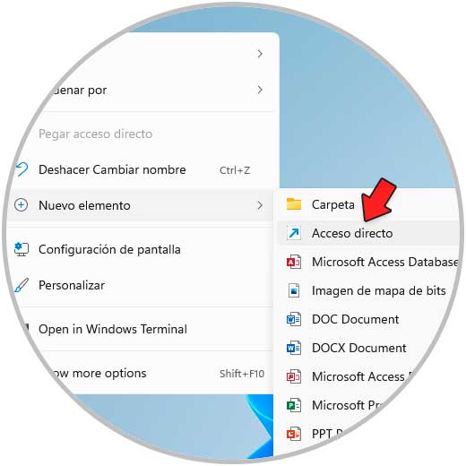 Crear un acceso directo nos permite abrir el Explorador de archivos con un doble clic, si deseamos usar este método, damos clic derecho en el escritorio y seleccionamos "Nuevo elemento - Acceso directo":