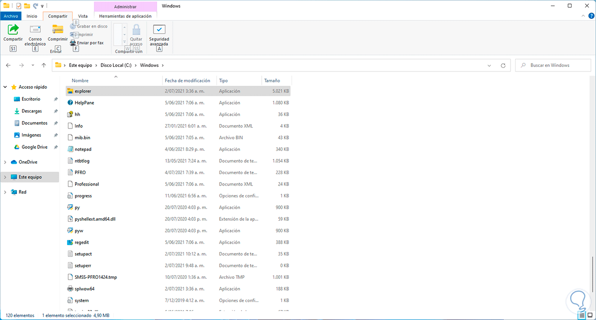 Finalmente es posible hacer uso del propio ejecutable del Explorador para abrirlo, en este caso vamos al Explorador de archivos y luego iremos a la ruta C:\Windows, allí buscamos el ejecutable de "Explorer":