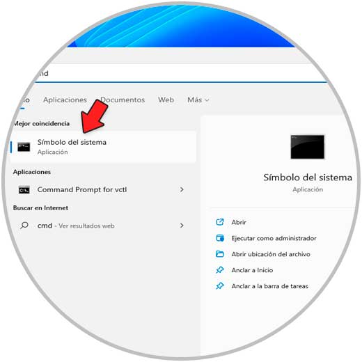 Otra de las tantas opciones es usando la consola del símbolo del sistema, para ello abrimos CMD desde el buscador: