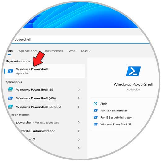 La consola de PowerShell es otra de las opciones para abrir el Explorador de archivos en Windows 11, abrimos PowerShell desde el buscador: