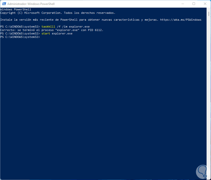 Desde la consola de PowerShell estamos en la capacidad de gestionar el reinicio de explorer.exe, abre PowerShell como administrador: