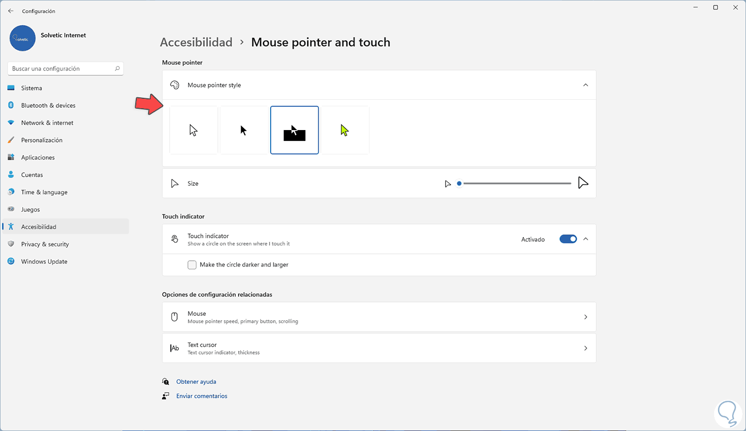 Vamos a la sección "Mouse Pointer" y allí es posible seleccionar alguna de las opciones disponibles en "Mouse pointer style":