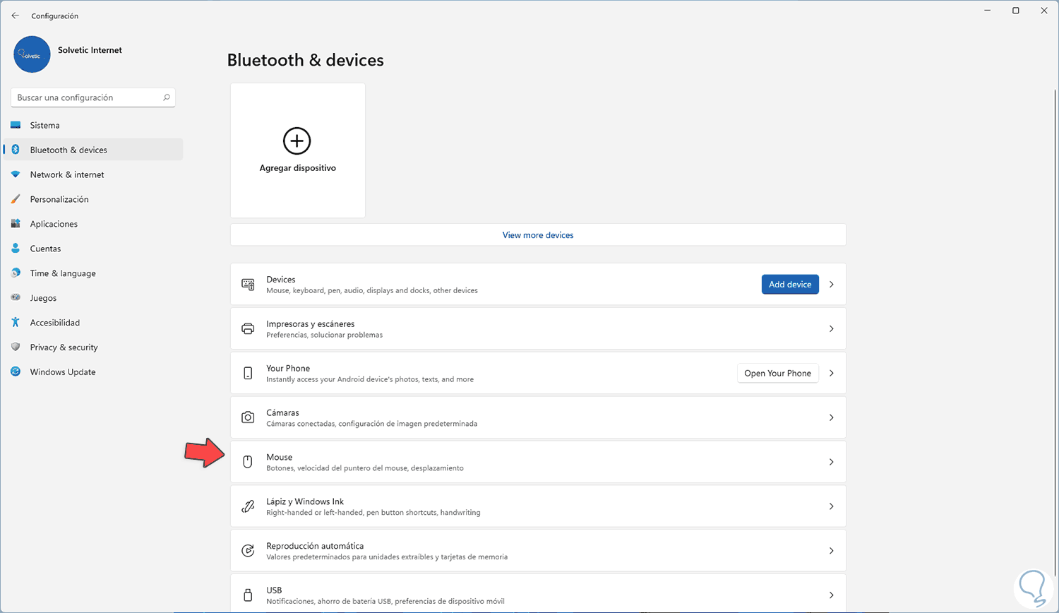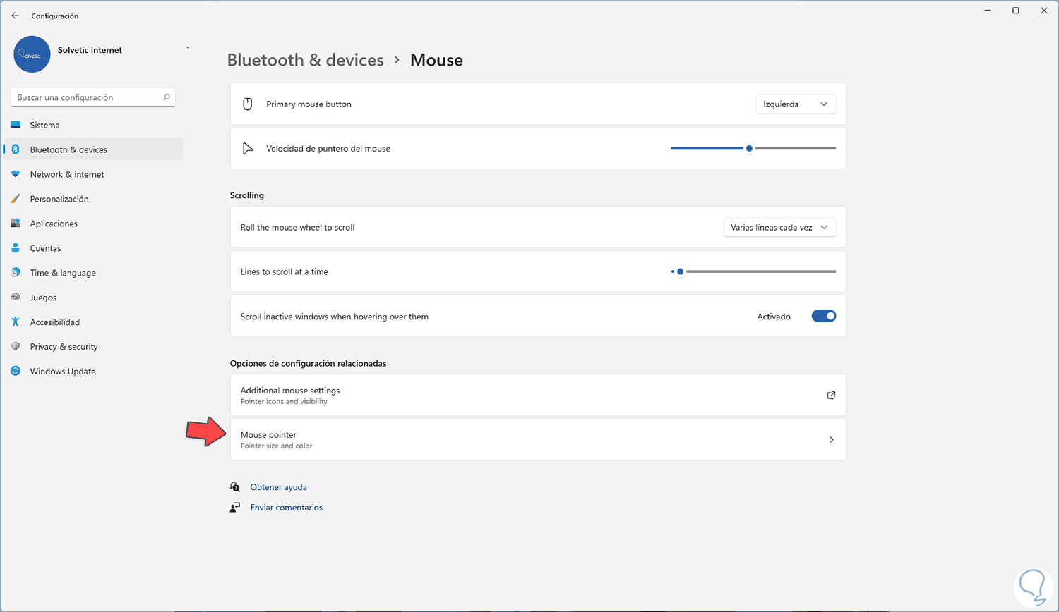 En Configuración vamos a "Bluetooth & Devices - Mouse":