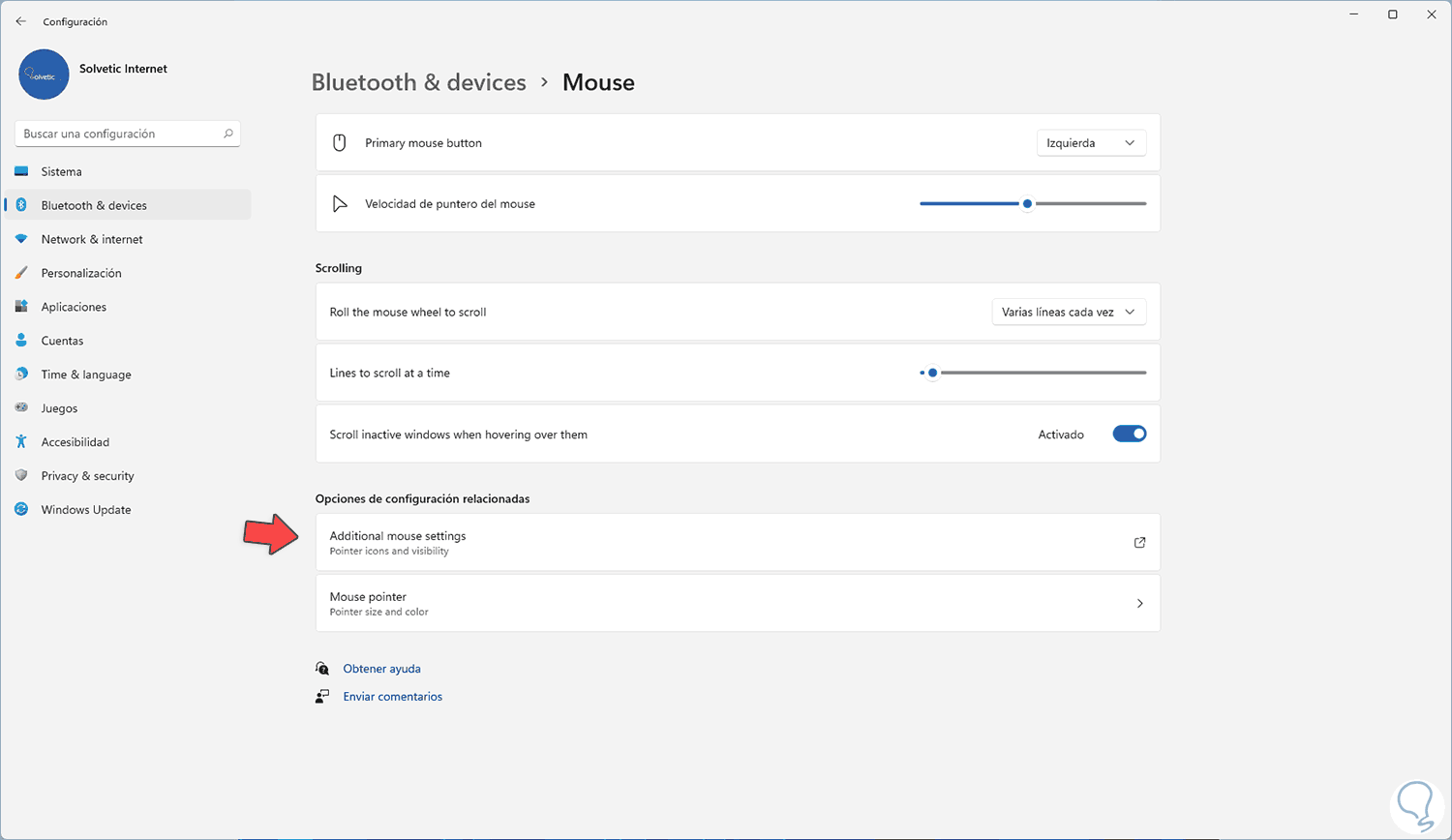 Ahora damos clic en "Additional mouse settings":