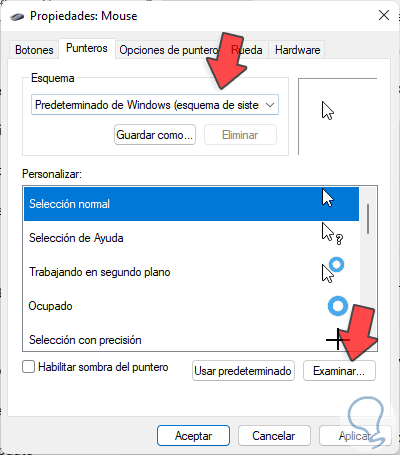 Ahora para personalizar el puntero, damos clic en "Examinar" y seleccionamos alguna de las opciones disponibles: