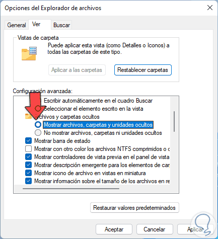 En la ventana emergente abierta, en la pestaña "Ver" activamos la casilla "No mostrar archivos, carpetas y unidades ocultos":