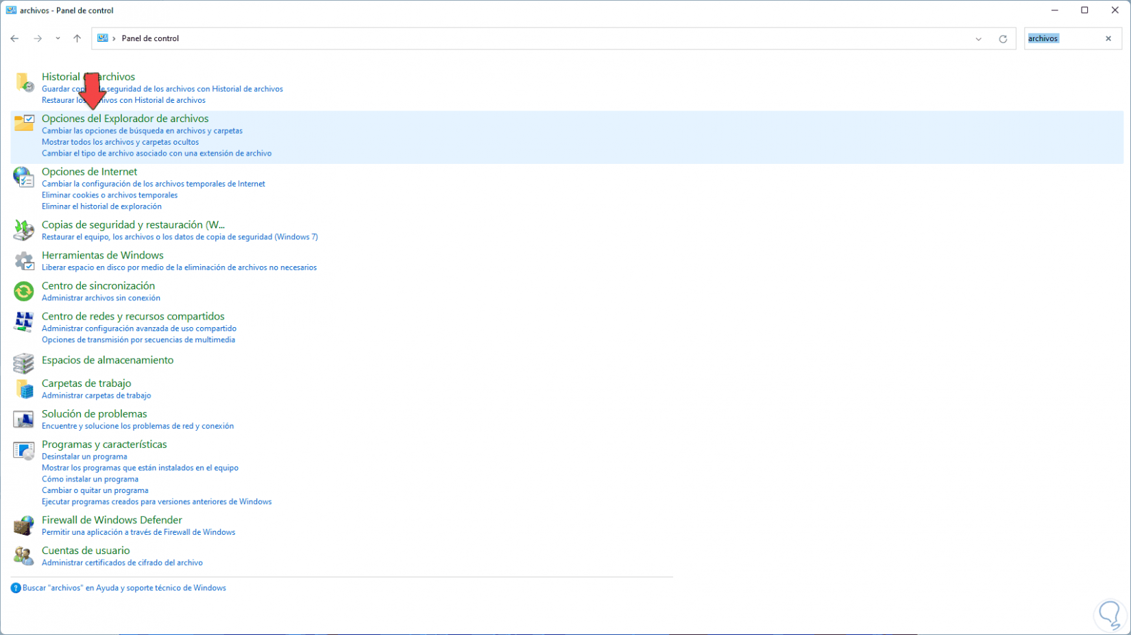 En el Panel de control, vamos al buscador e ingresamos "archivos", seleccionamos la opción "Opciones del Explorador de archivos":