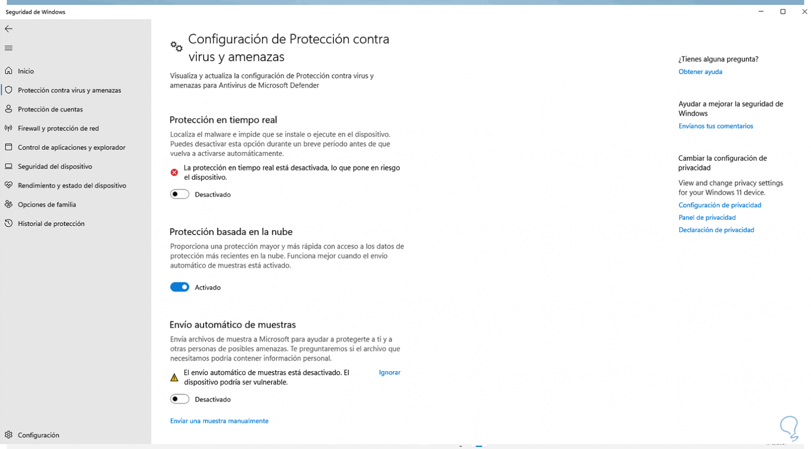 Desactivamos el interruptor "Activado" en "Protección en tiempo real":