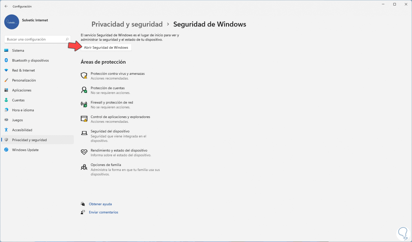 Damos clic en "Abrir Seguridad de Windows" para abrir la ventana respectiva: