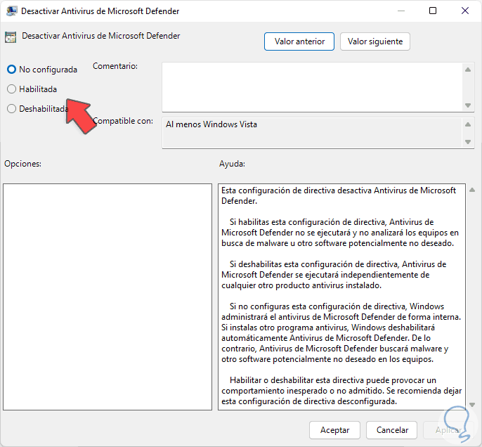 Aplica los cambios y de esta forma Windows Defender estará desactivado.