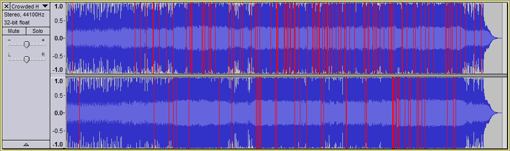 En la imágen podemos ver un audio distorsionado, para repararlo. Seleccionamos todas la pista con el mouse y luego vamos al menú Efecto > Reparar. Si la distorsion fuera solo un rudio o un sector, ampliamos haciendo zoom con la lupa sobre el sector dañado, lo seleccionamos y aplicamos Efecto > Reparar para reemplazar el audio seleccionado con el audio reparado.