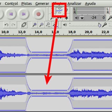 Otra opción avanzada es la edición por puntos, seleccionamos la pista y aparecerá punto so nodos que podremos modificar visualmente, esta herramienta se llama envolvente.