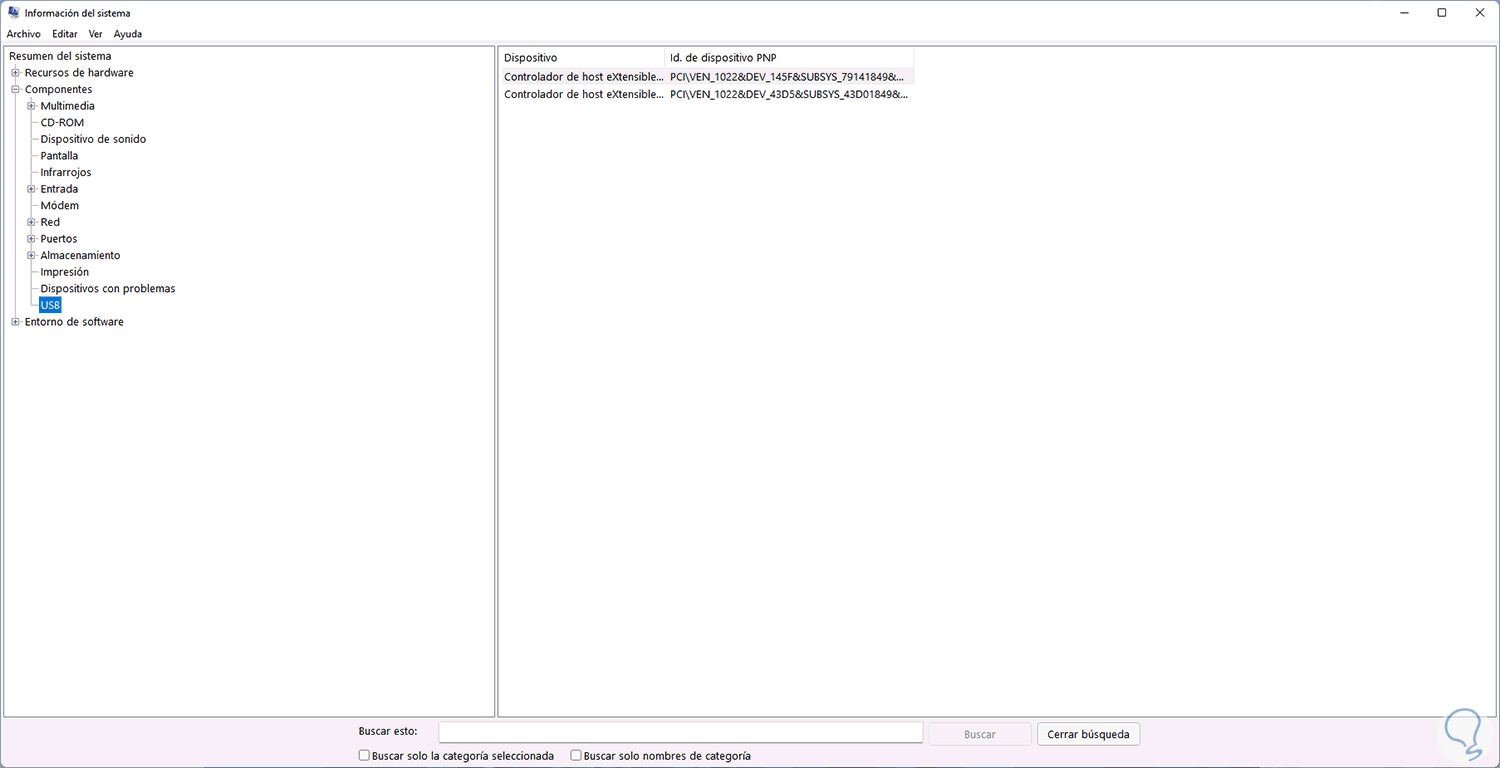 - Componentes: en esta sección tendremos acceso a detalles completos de los recursos de hardware en Windows 11, allí encontramos elementos multimedia, pantalla, USB, periféricos de red, dispositivos de audio y mas