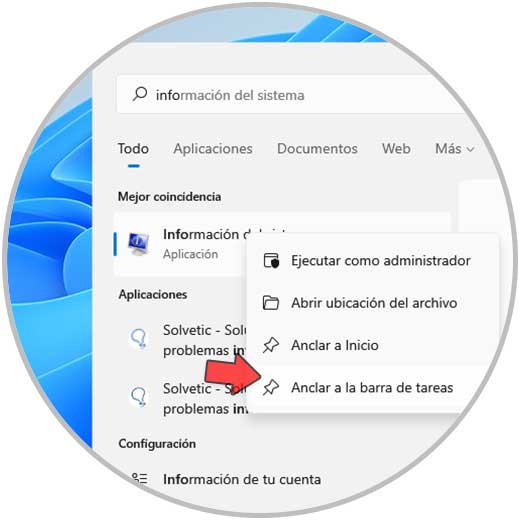 Buscamos tener un acceso a la Información del sistema desde la barra de tareas a un clic, para lograrlo, buscamos Información del sistema en Inicio, luego damos clic derecho sobre esta y seleccionamos "Anclar a la barra de tareas":