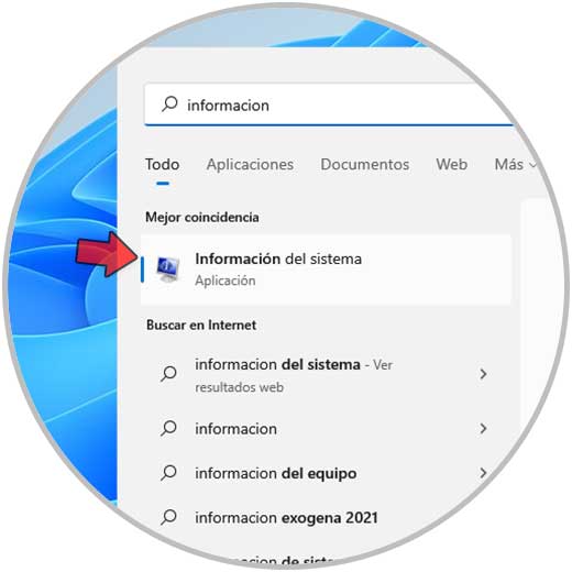 Esta es una opción sencilla, en el buscador de Inicio ingresamos "información". Seleccionamos "Información del sistema".