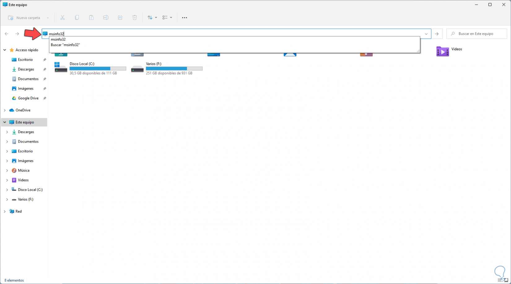 El Explorador de archivos no solo es útil para ver las unidades de disco y bibliotecas de Windows 11 sino que desde allí tendremos acceso a Información del sistema, para esto abre el Explorador de archivos y en el cuadro de nombre ingresamos "msinfo32":
