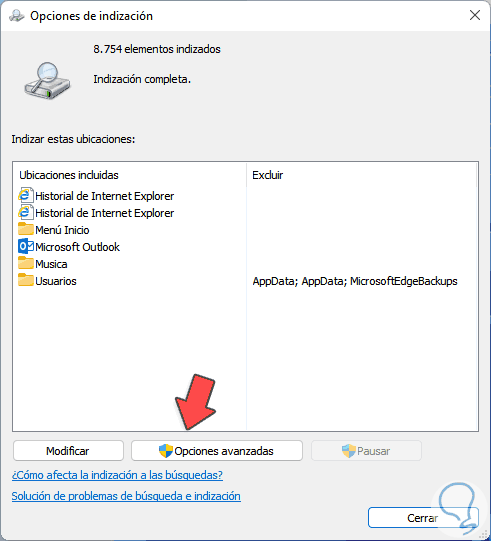 Aquí entrará en juego la indización, lo primero será ir al buscador de Inicio y allí ingresar "indización", luego selecciona "Opciones de indización":