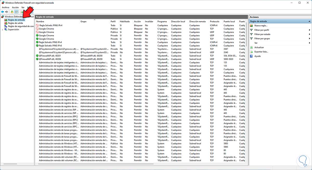Lluego, en la siguiente ventana, selecciona "Reglas de entrada":
