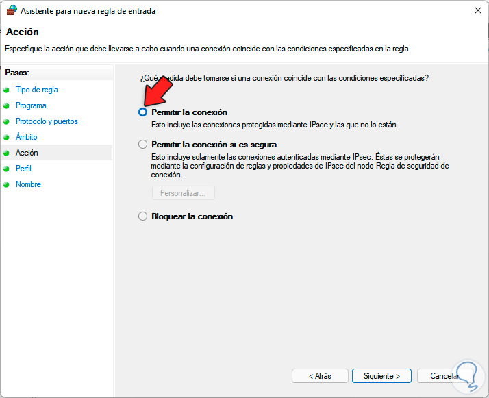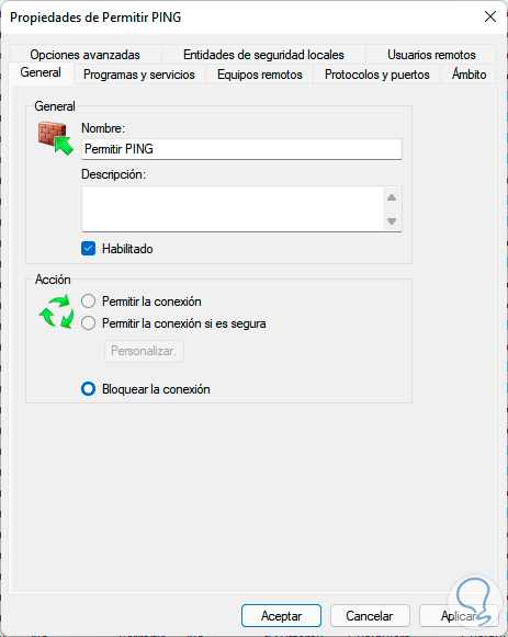 En la siguiente ventana activa la casilla "Permitir la conexión" para habilitar PING: