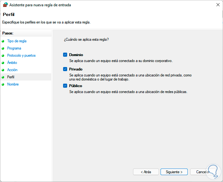 En la sección Perfil definimos donde aplica la regla:
