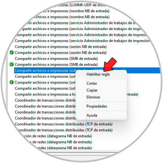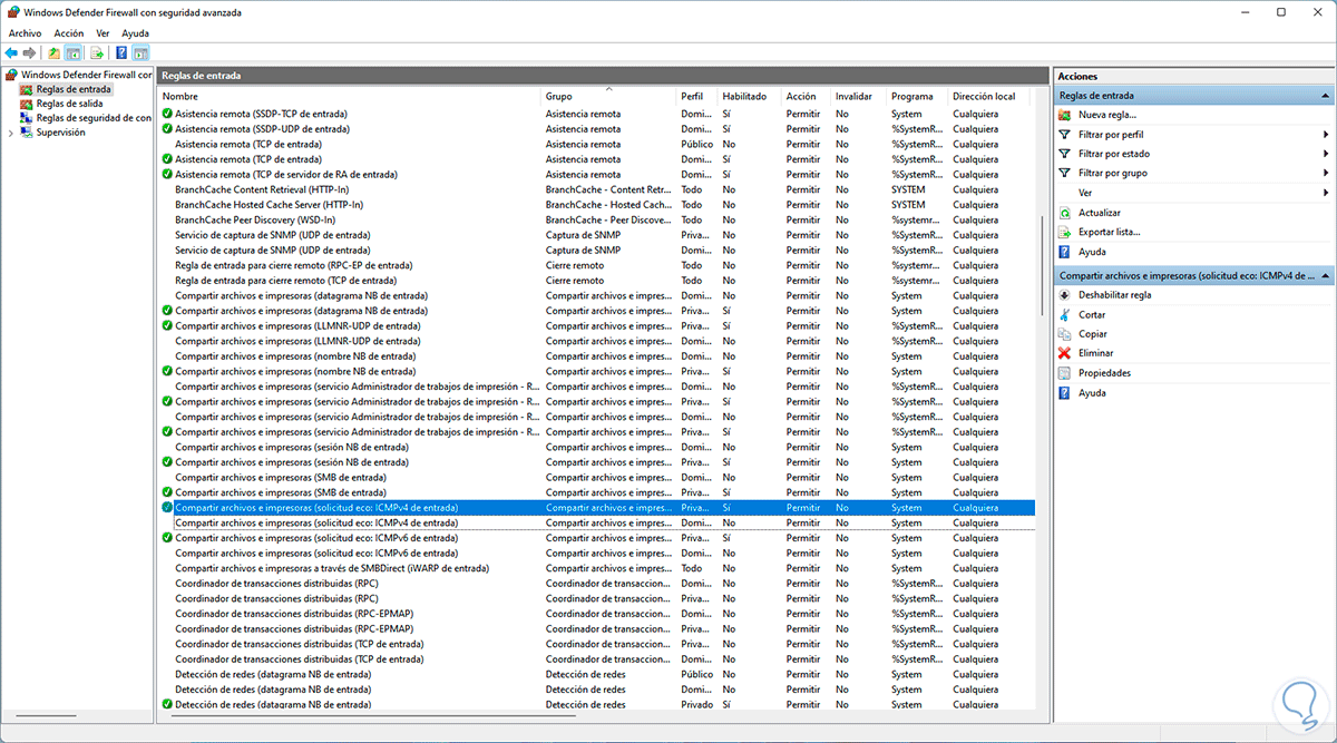 Selecciona las reglas de entrada, allí damos clic derecho sobre "Archivos e impresoras compartidos (petición eco: ICMPv4 de entrada)" y seleccionamos la opción "Habilitar regla":