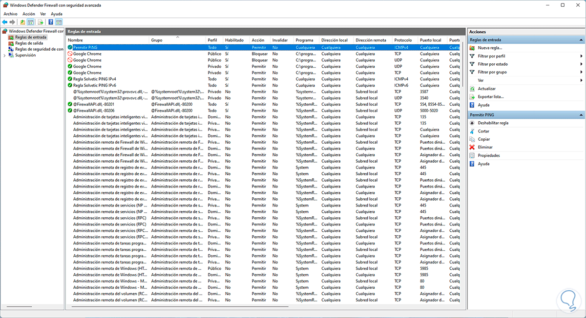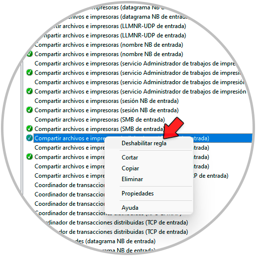Para esto, abre de nuevo el Firewall de Windows Defender y vamos a Reglas de entrada, allí damos clic derecho sobre la regla creada para habilitar IPv4 y seleccionamos la opción “Deshabilitar regla”: