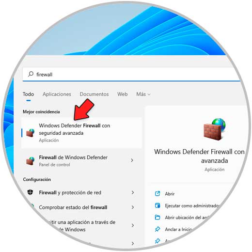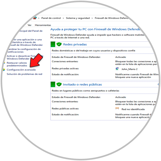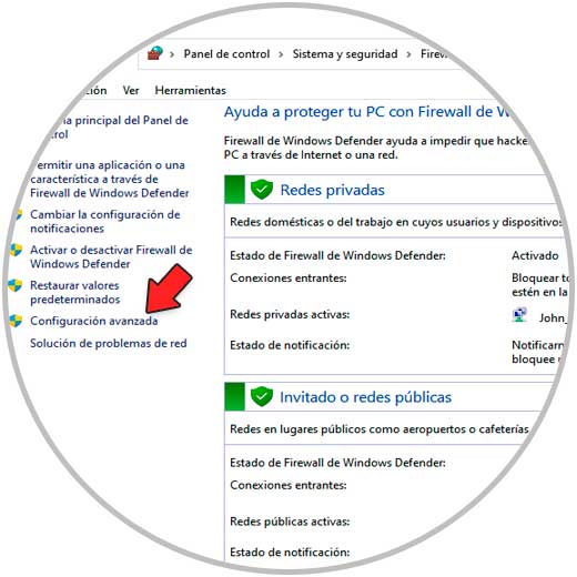 Para su habilitación, abre el Firewall de Windows Defender, luego ve a "Configuración avanzada" :