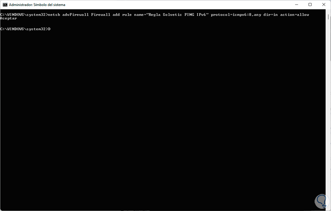 Esto creara una regla con el nombre asignado habilitando el PING en conexiones IPv4, Para habilitar IPv6 ejecutamos:
