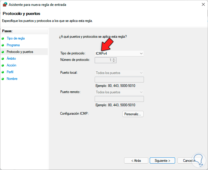 En la siguiente ventana, en "Tipo de protocolo" selecciona "ICMPv4":