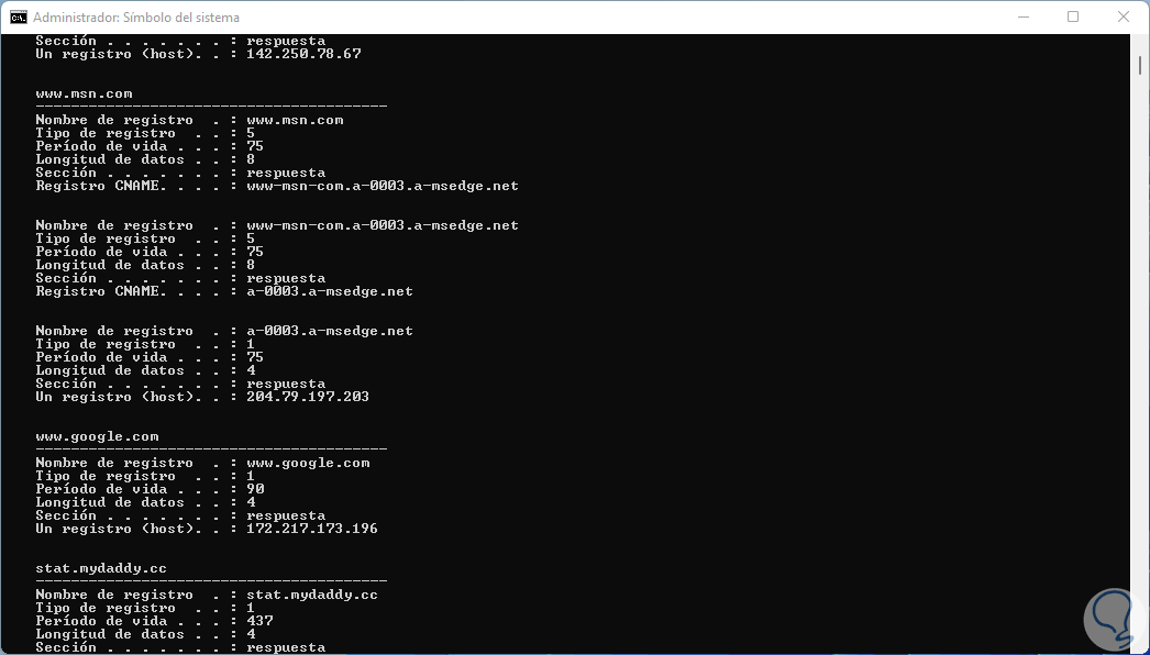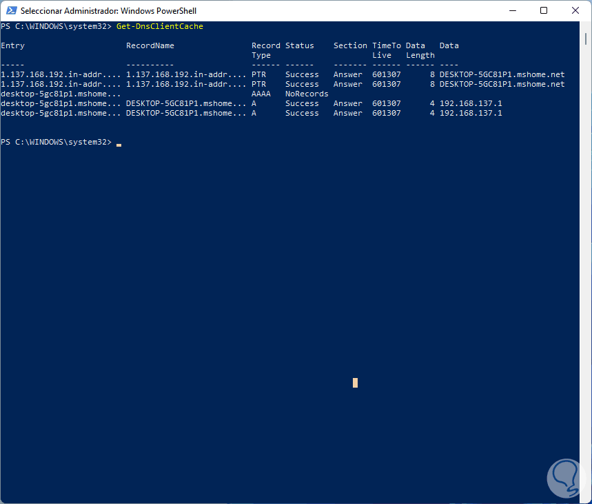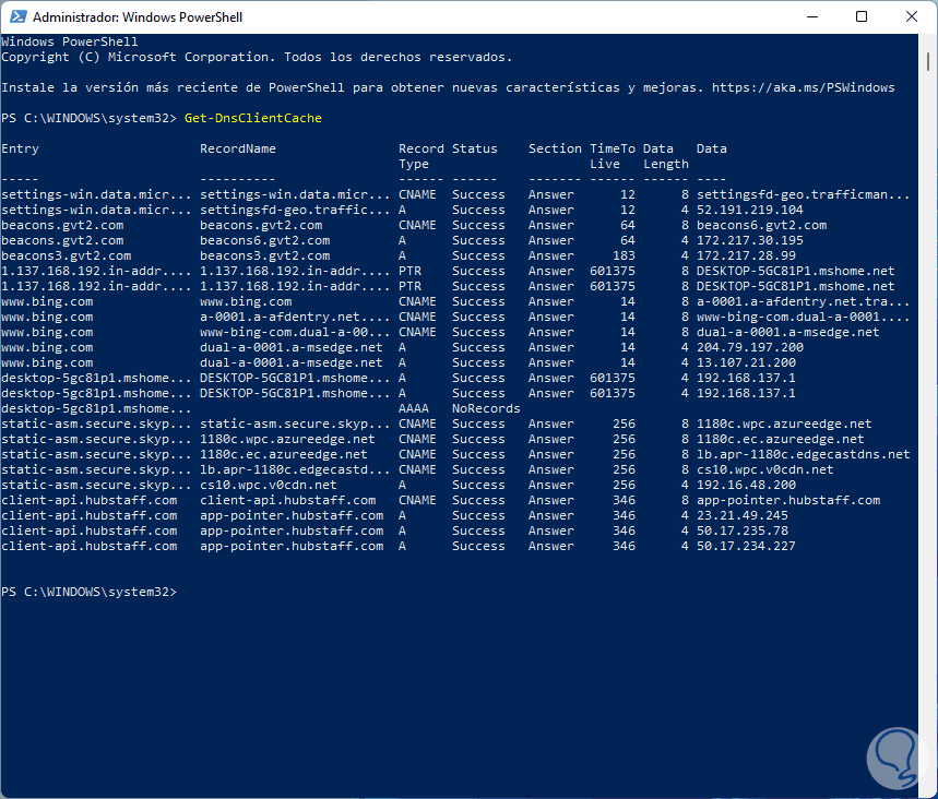 Podemos ver algunos registros DNS, pero estos son registros de redireccionamiento propios de Windows 11 por lo cual no pueden ser borrados.
