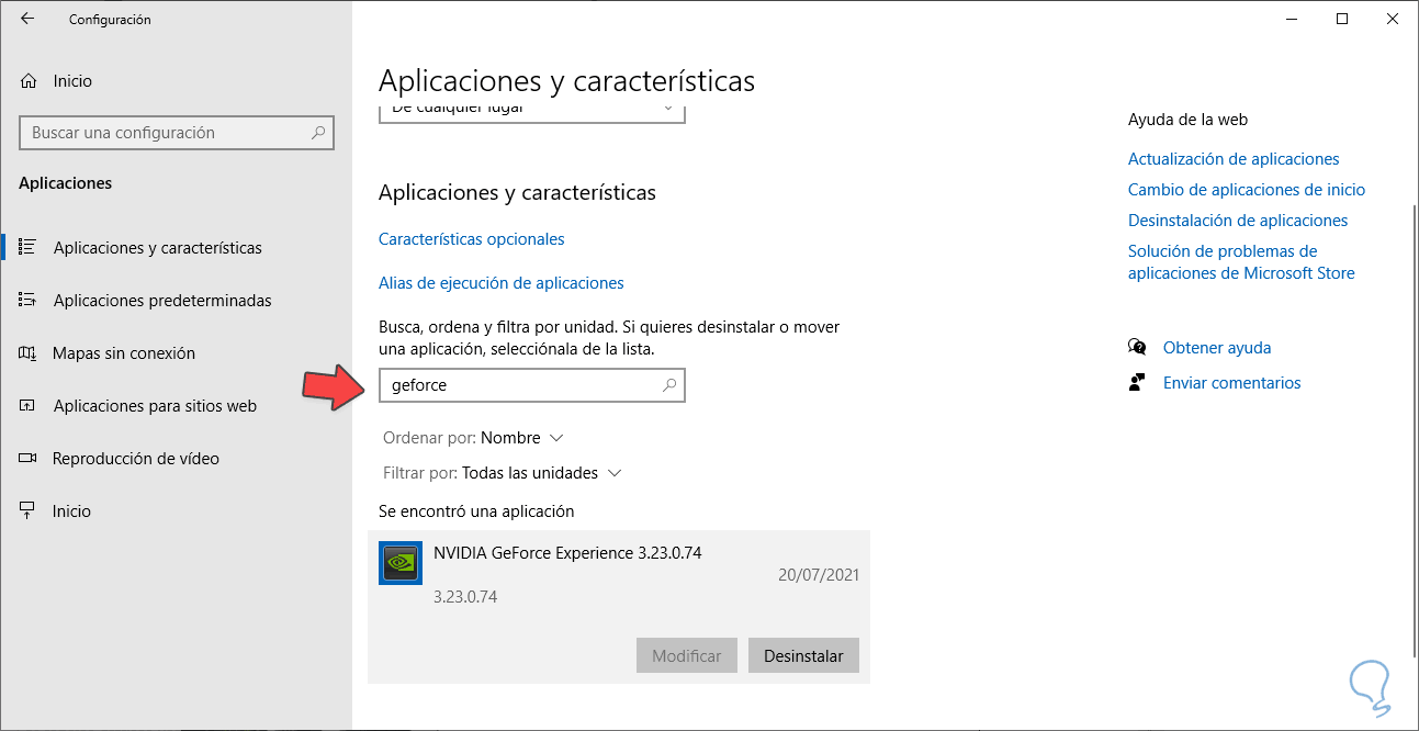 Ahora veremos que tenemos un listado de nuestros programas. Podemos utilizar la barra de búsqueda dentro para buscar "GeForce" rápidamente.