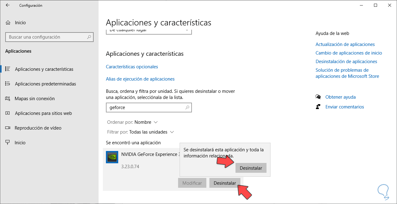 Ahora vamos a pulsar en "Desinstalar" y después pulsa de nuevo en esa acción en la ventana que se abre. Se habrá desactivado NVIDIA Geforce Experience ya que se ha desinstalado de tu equipo.