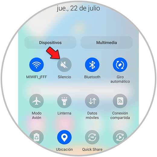 Otra de las opciones para quitar el sonido de la cámara en Samsung Galaxy M32, M42, M52 y M72, es pulsar en el menú de accesos directos. Una vez aquí activa el icono de "Silencio"