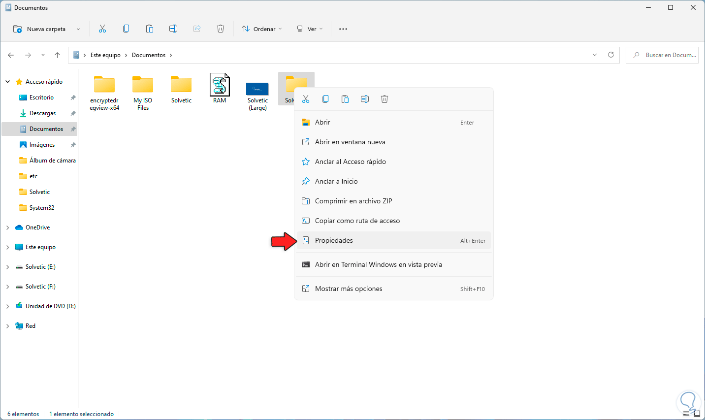 Lo primero será compartir una carpeta en Windows 11, para lograrlo damos clic derecho sobre la carpeta a compartir y seleccionamos la opción "Propiedades":