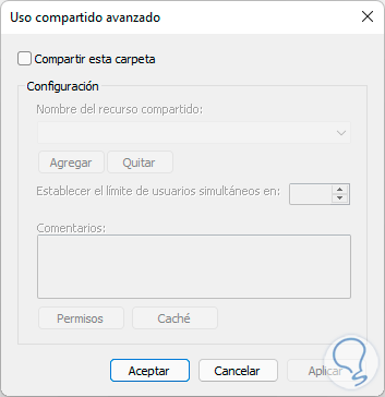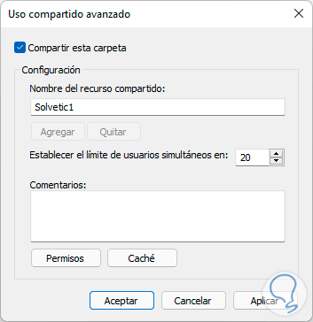 Activa la casilla "Compartir esta carpeta". Allí es posible establecer el nombre deseado o bien establecer los permisos y cuantos usuarios máximo pueden estar en simultaneo en ella.
