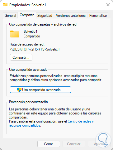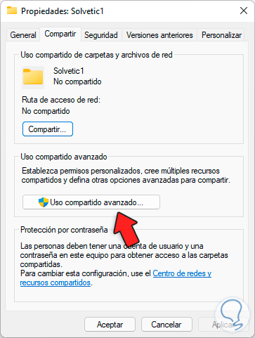 En la ventana emergente vamos a la pestaña "Compartir" y damos clic en "Uso compartido avanzado":