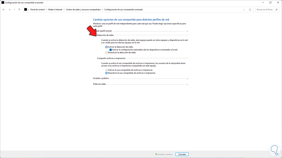 En caso de algún error, abre el Panel de control, da clic en "Ver el estado y las tares de red", luego da clic en "Cambiar configuración de uso compartido avanzado" y debemos activar la casilla "Activar la detección de redes":