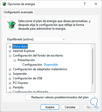 Damos clic en "Cambiar la configuración avanzada de energía" y en la ventana emergente seleccionamos "Configuración del fondo de escritorio" y validamos que "Presentación" este en Disponible: