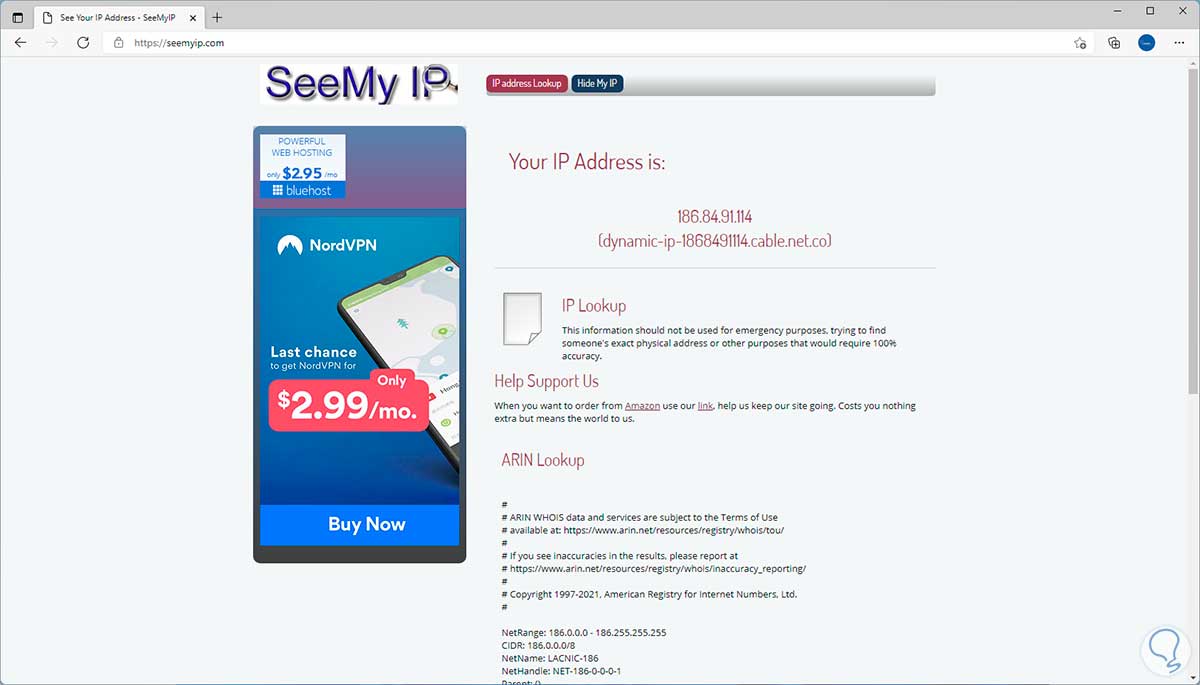 Para el caso de la dirección publica los pasos anteriores no nos dan detalles, pero muchos sitios web si, en un navegador web usa alguna de las URL para ver la IP pública del sistema operativo Windows 11: