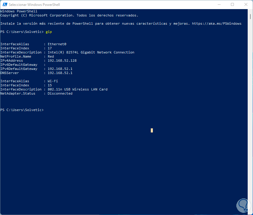 En PowerShell también es posible ejecutar "Get-NetIPConfiguration" para listar las propiedades de la red: