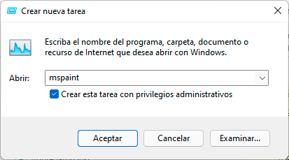 En la ventana emergente ingresa "mspaint" y activa la casilla "Crear esta tarea con privilegios administrativos":