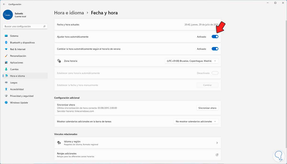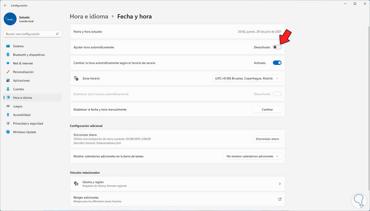 Desactiva el interruptor "Ajustar hora automáticamente":