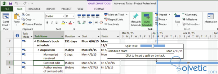 4- Ahora vamos a dividir la tarea para colocar el momento en que vamos a continuar la tarea, para ello haremos click en dividir tarea en la pestaña Tarea en el grupo Cronograma.