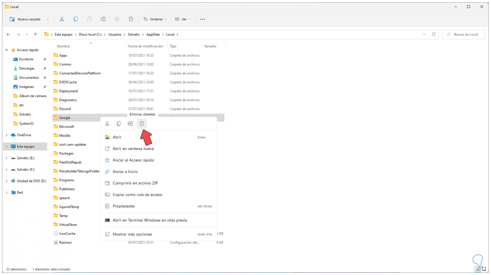 Ahora vamos a la ruta "C:\Users\usuario\AppData\Local", allí borramos la carpeta Google:
