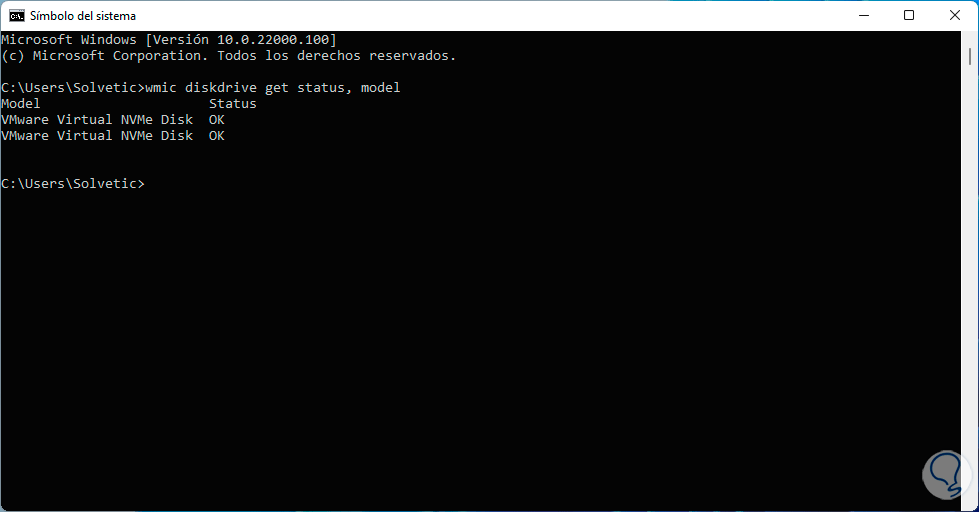 Ejecuta "wmic diskdrive get status, model" en la consola de CMD. Allí encontramos el modelo del disco y su estado actual de este.
