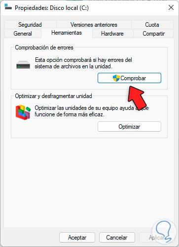 En la ventana emergente, en la pestaña "Herramientas" damos clic en "Comprobar":