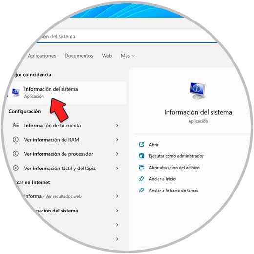 Información del sistema es un punto central para acceder a detalles completos del disco. Para esto abrimos Información del sistema desde el buscador:
