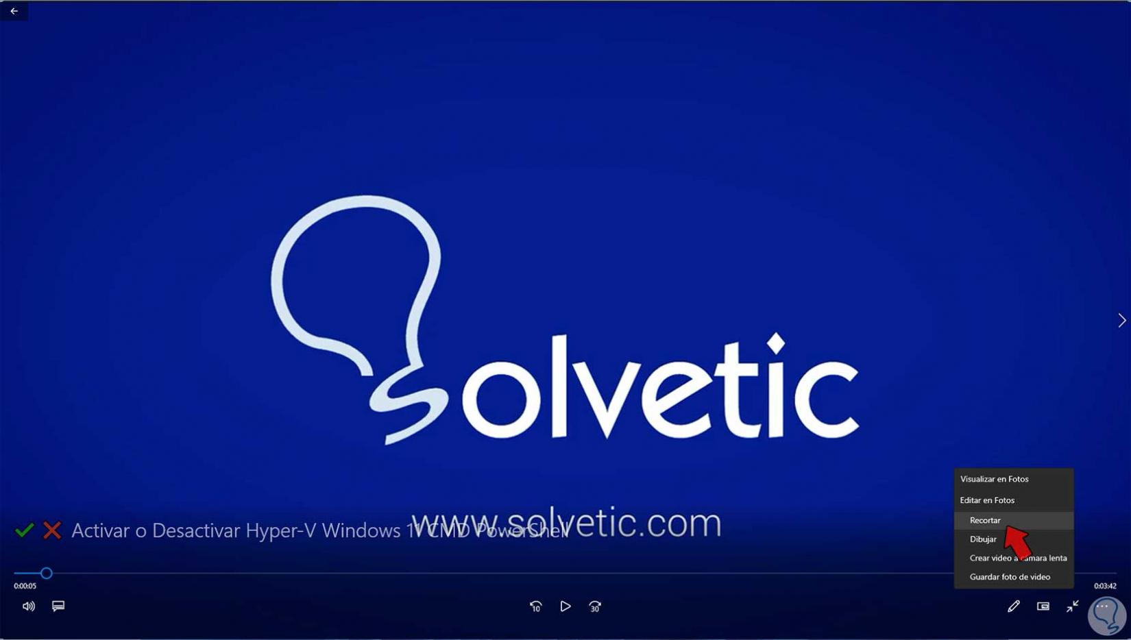 El vídeo se reproducirá con esta aplicación, allí damos clic sobre el lápiz para seleccionar "Recortar":